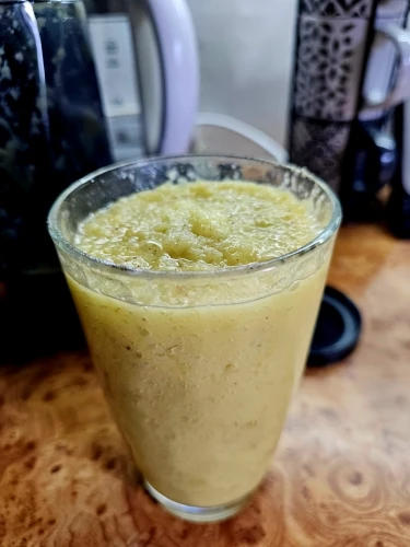 In the glass: apple, banana, orange, brown, a little water, I mixed everything perfectly